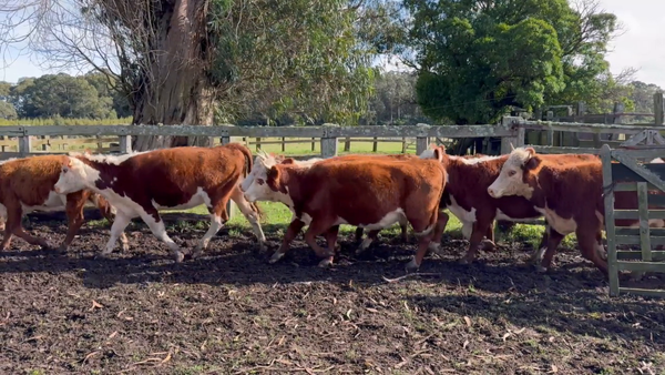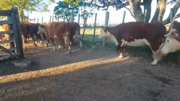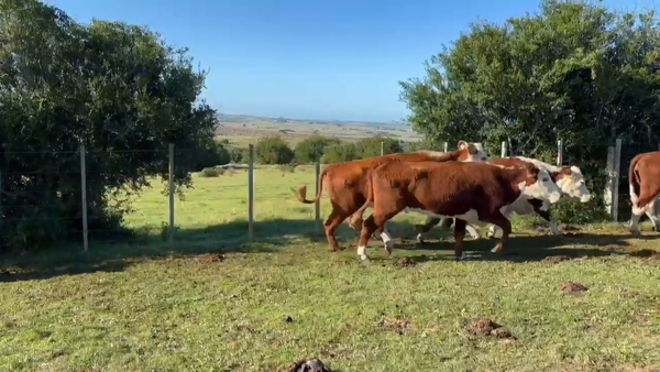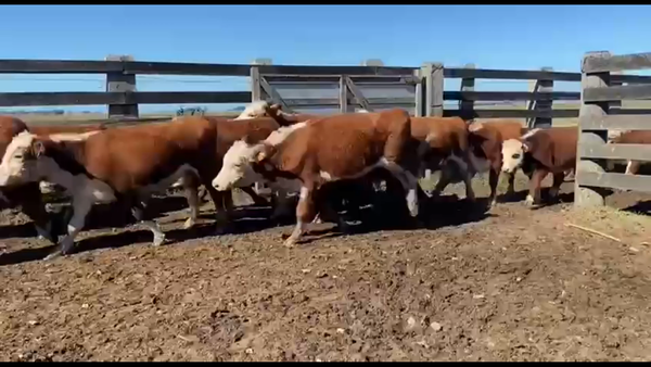 Muy buen lote de novillos mayoria Hereford. Animales de buen cuerpo, buena costilla, futuras carcasas pesadas y de calidad. 3 con ojo seco, 5 con nube.